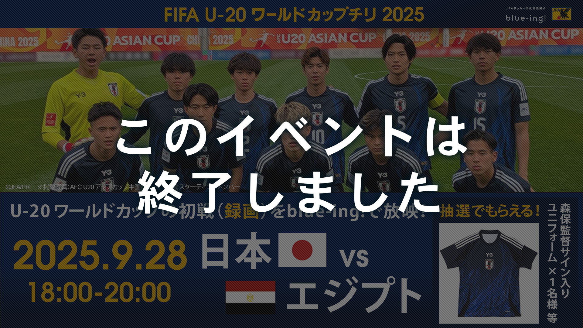 U-20日本代表を一緒に応援しよう! JFAサッカー文化創造拠点「blue-ing!」では、『FIFA U-20ワールドカップチリ 2025』のディレイビューイング(録画放映)を開催いたします。 U-20日本代表 注目の初戦を、ファンのみなさまと一緒に振り返りましょう! 森保一監督のサイン入りユニフォーム(1名様)やU-20選手サイン入り景品(ミニボール2名様・色紙6名様)が当たる抽選会もご用意しております。 下のリンク先より、入場チケットをお申込みの上、ぜひご来場ください。